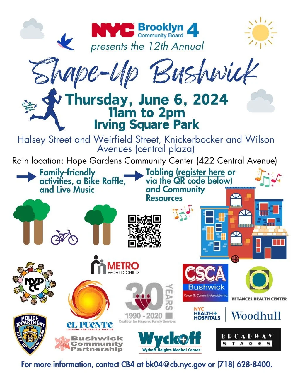Join Brooklyn Community Board 4 for the 12th Annual ShapeUp Bushwick event at Irving Square Park! Come out and stretch with your neighbors for a day of health and fitness. Activities include pilates, disc golf, a bike raffle, activities for the kids, and much more! It’s all free!